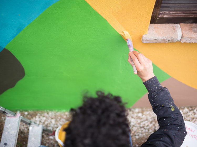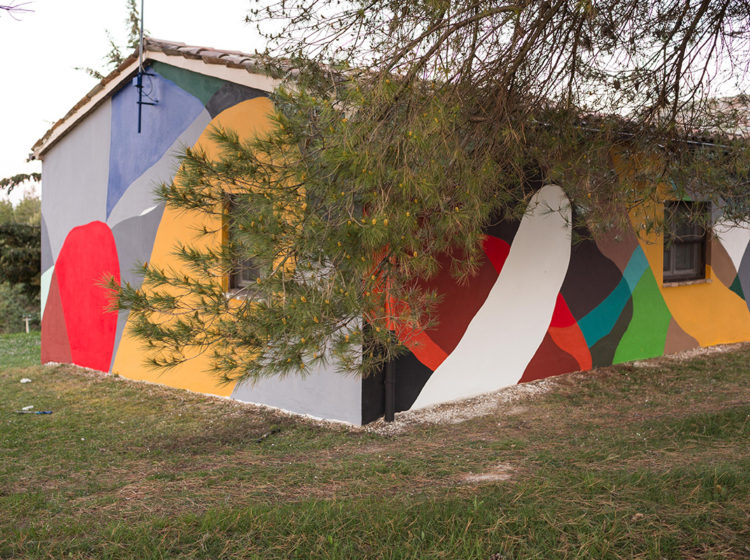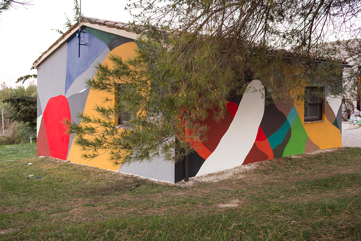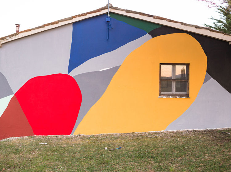 Lontano dai grandi spazi metropolitani e urbani in cui è chiamato a lavorare in tutto il mondo, Moneyless si confronta in questo caso con il paesaggio naturalistico e rurale delle Marche in un’esperienza totalizzante che nasce da un viaggio a tappe partito all’Antica Stamperia di Carpegna dove l’artista ha sperimentato per la prima volta la tecnica del blockprint realizzando un tessuto d’artista per il progetto Pop Up! Gluppa.