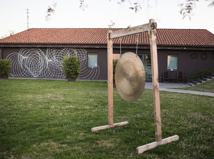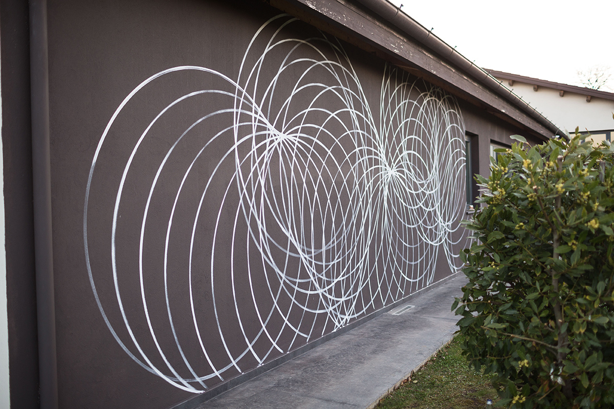 La seconda opera, realizzata sulla facciata del Centro Benessere, porta la firma inconfondibile dell’artista. Moneyless disegna cerchi concentrici e spirali sovrapposte con un grande compasso costruito con frammenti di legno trovati nel bosco. Il cerchio, elemento geometrico prediletto dall’artista, da sempre simbolo della ciclicità del tempo nonché del rapporto tra l’uomo e il cosmo, scandisce così in maniera dinamica, mistica e ipnotica la superficie della Spa.