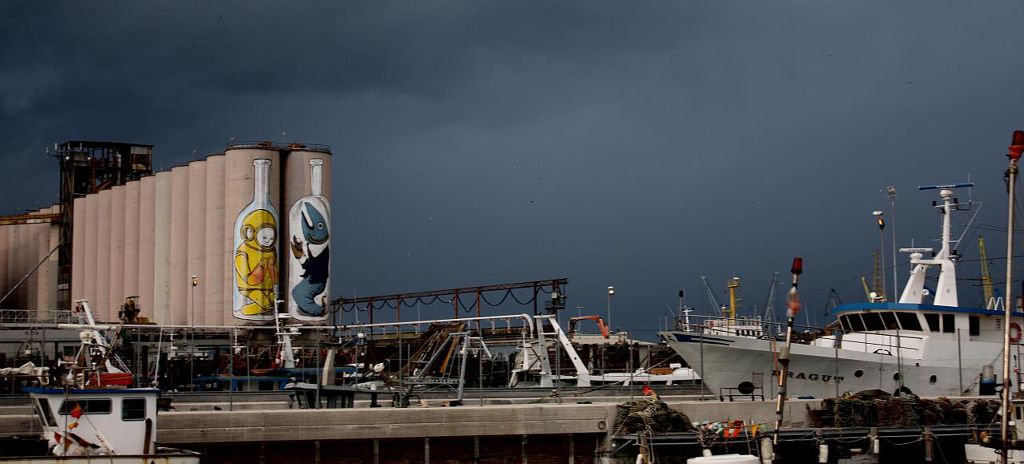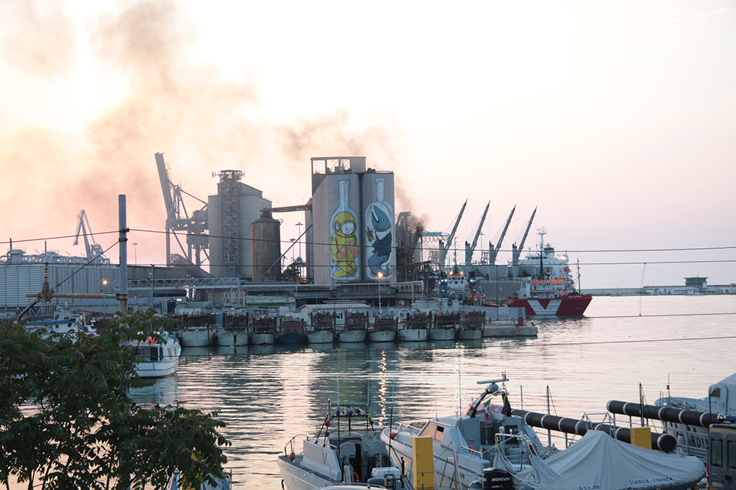 Spazio ibrido tra mare e terra ferma, il porto di Ancona è dominato dai silos, presenze ingombranti nell’identità di Ancona. E’ su questi enormi cilindri di cemento che Ericailcane e Blu sono intervenuti con rulli e colori, ridisegnando lo skyline della città. Oltre a un indiscusso valore artistico, “Bottles” ha anche un potente valore culturale: l’opera d’arte interviene nel percepito collettivo, sostituendo al meccanismo di rimozione del degrado e del grigiore, quello della risignificazione di luoghi chiave della città. (Serena Vialetti)