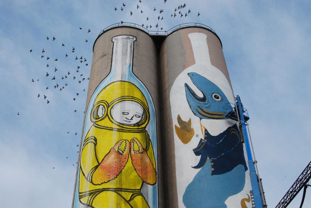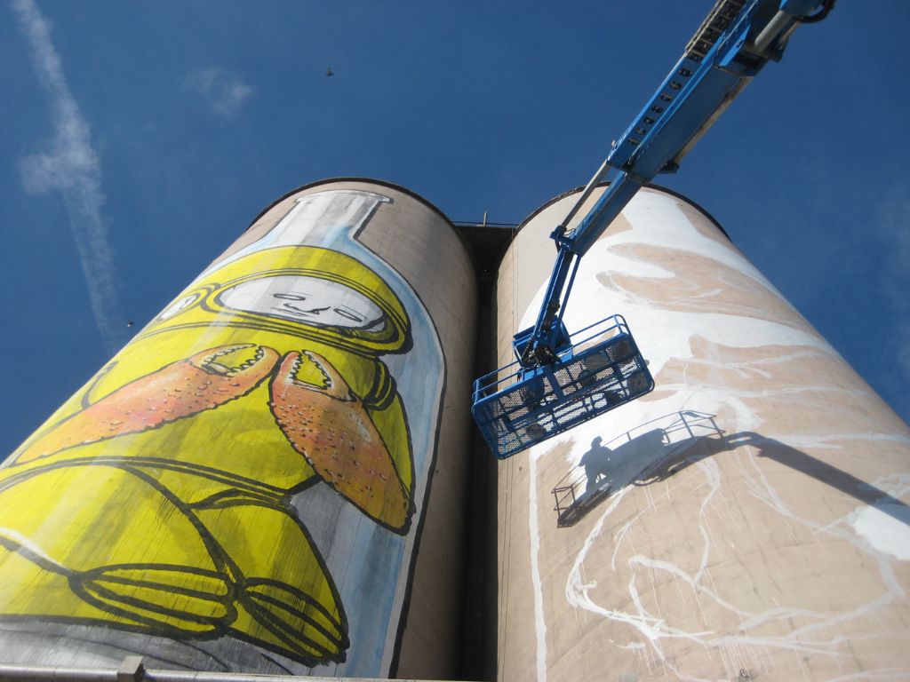 Blu inizia l’opera realizzando la prima “bottiglia” e poi Ericailcane conclude il lavoro intervenendo sul secondo silos.